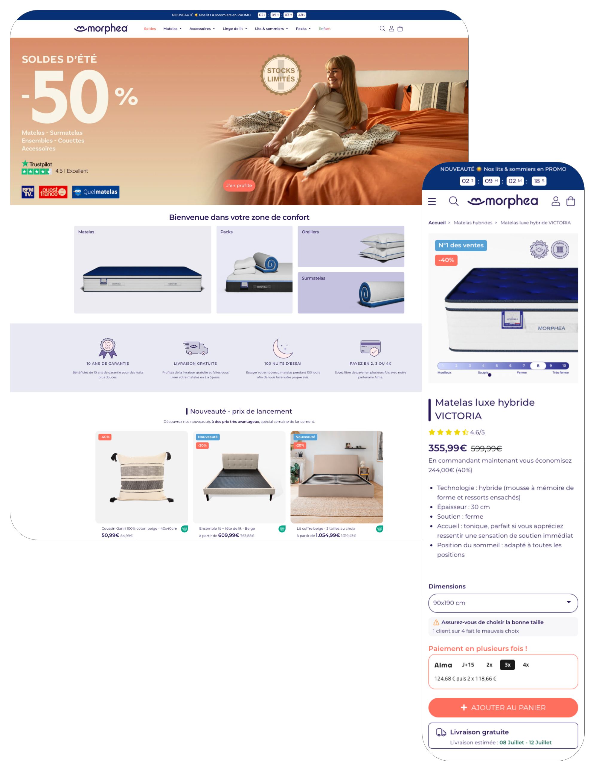 Nous sommes ravis de notre collaboration avec Morphea, une marque innovante dans le secteur des matelas. Notre mission a été de favoriser leur croissance dynamique par une refonte intégrale sur Shopify, un rafraîchissement de leur identité de marque, et une amélioration ciblée de leur contenu.